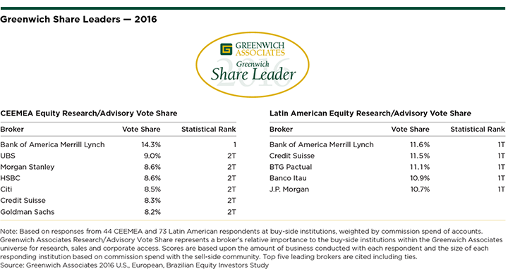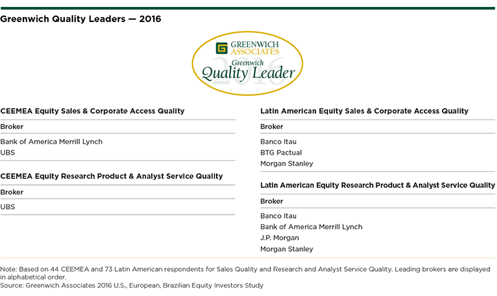 The 2016 Greenwich Share and Quality Leader designations are awarded to brokers based on the results of interviews conducted by Greenwich Associates with 44 North American and European investors in CEEMEA equities and 73 North American, European, and Brazilian investors in Latin American equities. Greenwich Quality Leaders℠ are firms that receive quality ratings from their institutional clients in sales and in research/analyst service that top those awarded to competitors by a statistically significant margin.