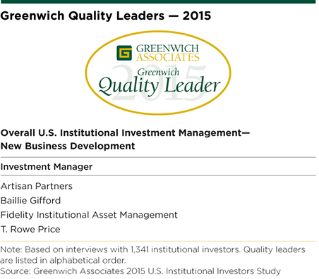 The 2015 Greenwich Quality Leaders℠ in U.S. Institutional Investment Management—New Business Development are Artisan Partners, Baillie Gifford, Fidelity Institutional Asset Management, and T. Rowe Price.