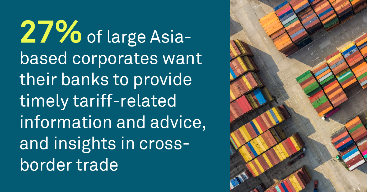 More than a quarter (27%) of large Asia-based corporates want their banks to step up and provide tariff-related information and advice, including proactive, real-time updates, economic and regulatory analysis, and insights on hedging strategies and other aspects of cross-border trade.