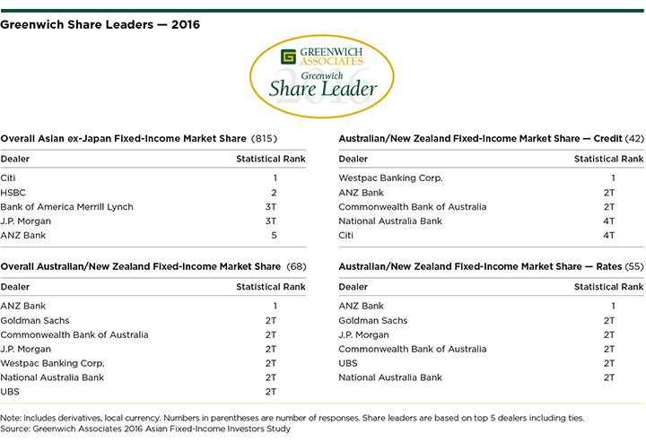 NZ Bank and Westpac Banking Corp. are the 2016 Greenwich Quality Leaders in Fixed-Income Sales, and Citi and Commonwealth Bank of Australia claim the title in Fixed-Income Research. In Fixed-Income Trading the 2016 Greenwich Quality Leaders are ANZ, Citi and Commonwealth Bank of Australia.