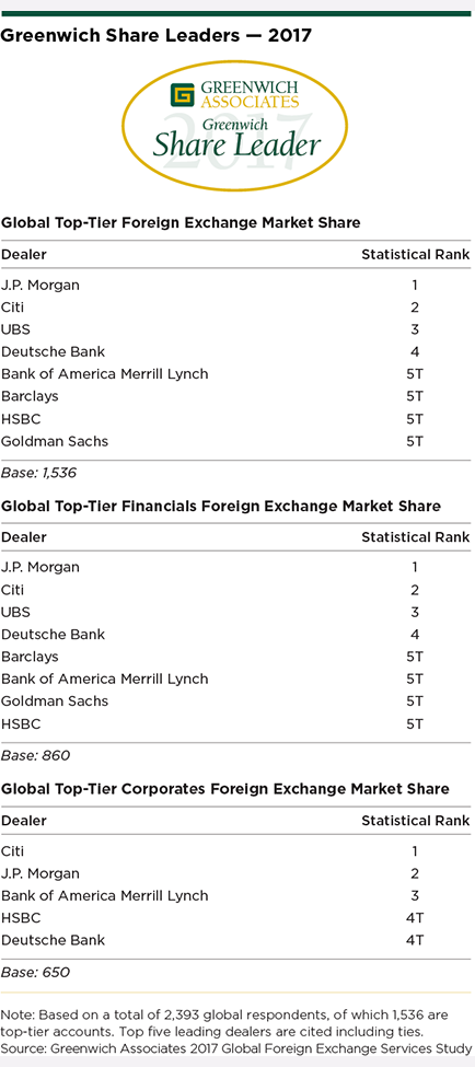 In 2017 that list expands to eight. J.P. Morgan claims the top spot, followed by Citi, UBS and Deutsche Bank. Tied for fifth place are Bank of America Merrill Lynch, Barclays, HSBC, and Goldman Sachs. These banks are the 2017 Greenwich Share Leaders℠ in Global Foreign Exchange.