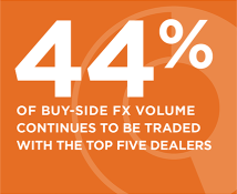 While the percentage of trading the buy side does with the top five dealers remains notably large at 44%, it has continued its decline from a peak of 53% in 2013, with regional dealers stepping up their game and, to a lesser extent, principal trading firms entering the fray. This now makes the FX market one of the least concentrated among over-the-counter markets, which provides welcome diversity for financial end-users, regulators and emerging dealers.
