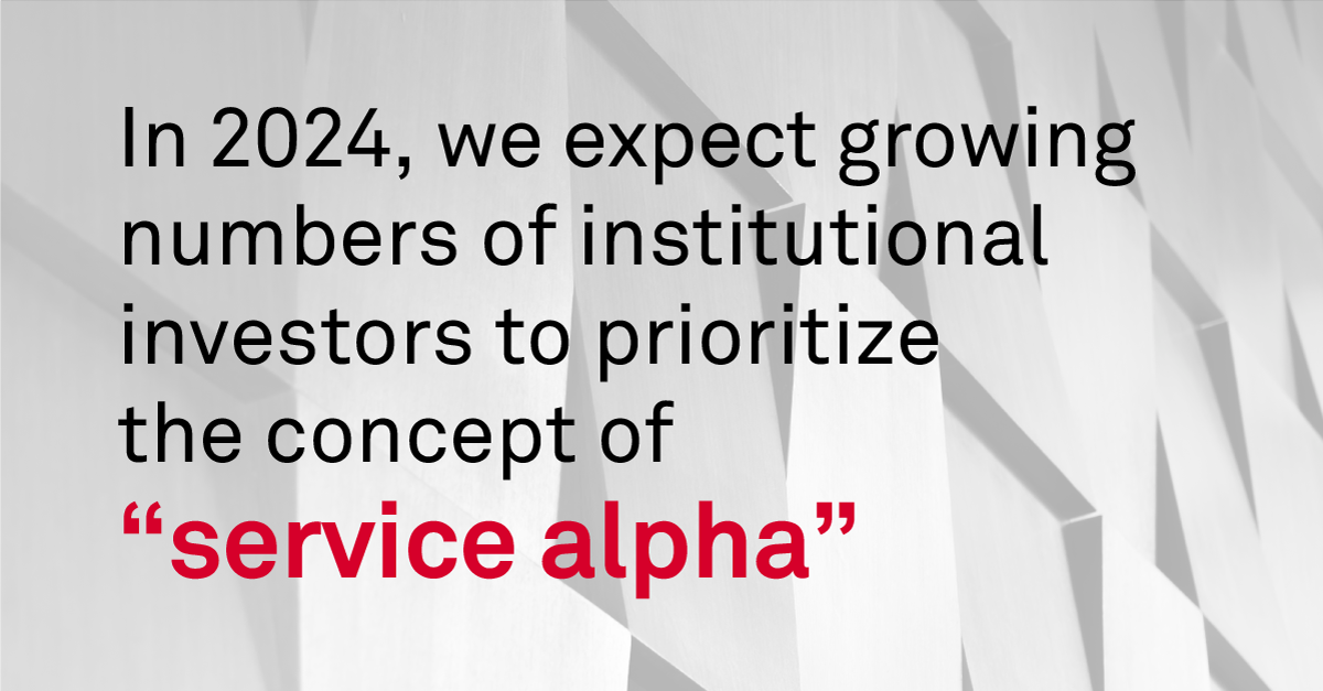• Service Quality: A Focus on “Service Alpha”: Institutional investors are aware of the growing variation in service quality among the asset managers they employ. In 2024, expect growing numbers of institutional investors to prioritize the concept of “service alpha,” or the client service value that managers provide.
