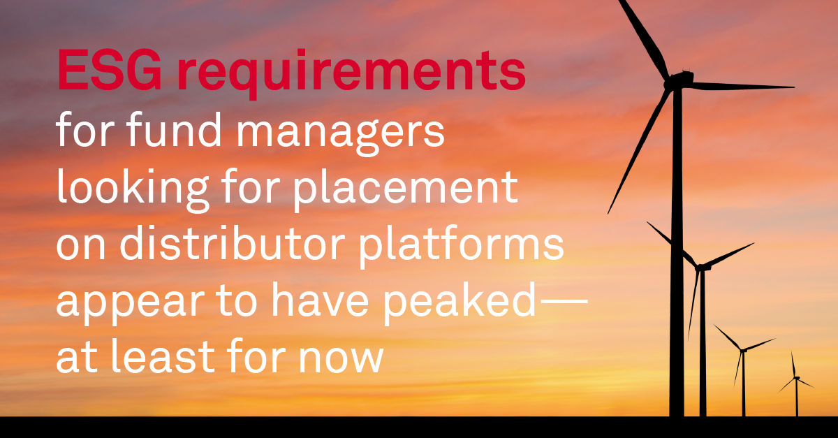 Since at least 2020, retail banks, private banks, insurance companies, independent financial advisors, and other wholesale fund distributors in Europe and Asia have increasingly adopted ESG requirements for fund managers looking for placement on their platforms.